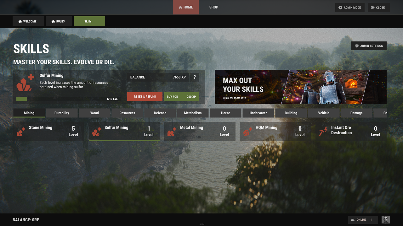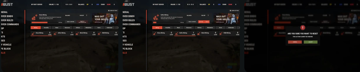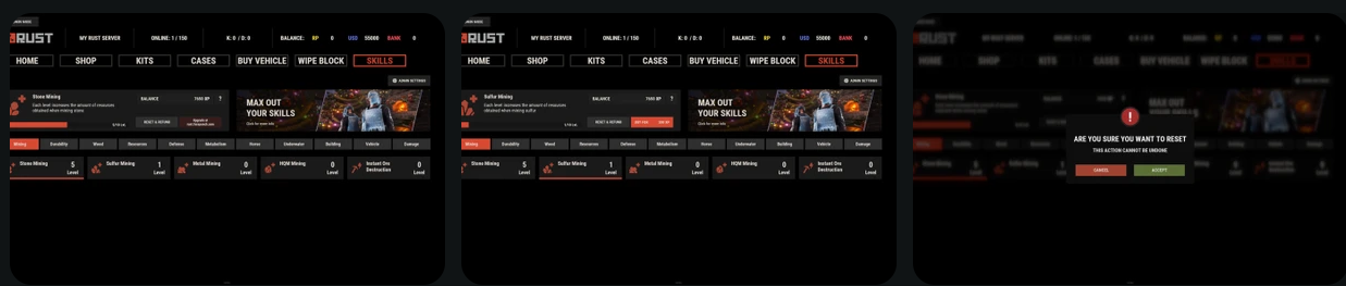 技能系统包含了庞大的预配置技能库,涵盖了Rust游戏玩法的各个方面。所有技能都已准备好使用,采用平衡的10级进阶系统!