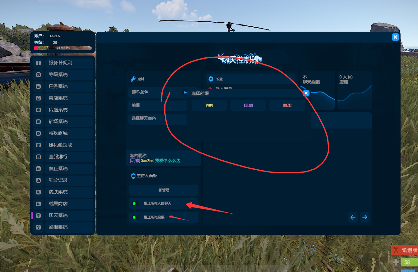 私人消息系统 : 玩家可以相互交流并进行私人对话,该插件内置了对使用 /pm 和 /r 命令的玩家消息的支持 玩家可以添加另一个不需要的玩家来忽略,他将不再看到来自他的 私人消息 日志记录 : 强大的日志记录功能,单独启用。 所有日志记录都通过 WebHooks 发送到您的 Discord 频道! 支持的插件:此时, 该插件已经拥有一个大型的受支持插件数据库,并且正在协同工作! 支持:IQ 和 TP 插件的整个分支、XLevels、Clans、TranslationAPI、XPrison、Friends 和许多其他插件! 这使您可以在服务器上创建一致风格的消息和通知! 如果您是开发人员并希望将您的插件链接到我的 - 请查看 API 选项卡。 对于所有问题 - 您可以亲自 权限 iqchat.admin --- 管理员 连接 静音使用 在线隐藏 重命名使用 iqchat.adminmuted ---- 管理员 iqchat. alertuse ---- 管理员静音 iqchat.antispamabuse 警报使用 iqchat.bigBoy ---- 反垃圾邮件 iqchat.default ---- 默认 iqchat.hideconnection ---- 隐藏连接 iqchat.hidedisconnection ---- 隐藏断开连接 iqchat.muteuse ----- 静音使用 iqchat.onlinehide ---- 在线隐藏 iqchat.renameuse ----- 重命名使用 配置 { "设置玩家信息": { "功能开关": { "当玩家获得该前缀时,自动为该玩家设置前缀": true, "当玩家获得昵称颜色时,自动为玩家设置昵称颜色": true, "当玩家获得权限时,自动为玩家设置聊天颜色": true, "当玩家对前缀的权限过期时自动重置前缀": true, "当玩家对昵称颜色的权限过期时,会自动重置昵称颜色": true, "当玩家的权限过期时,自动重置聊天颜色": true }, "配置标准值": { "如果玩家是第一次进入服务器,或者他之前对前缀的权限过期,则将建立此前缀": "<color=#CC99FF>[玩家]</color>", "如果玩家是第一次进入服务器,或者他之前对昵称颜色的权利已过期,则会设置此昵称颜色": "#0099FF", "如果玩家是第一次登录服务器,或者他之前对聊天颜色的权限已过期,则会设置此聊天颜色": "#33CCCC" } }, "设置播放器的选项": { "设置播放器选择的参数显示": { "玩家前缀选择显示类型 - (0 - 下拉列表,1 - 滑块(请注意,如果您启用了多前缀,将设置一个下拉列表))": 0, "播放器的昵称颜色选择的显示类型 - (0 - 下拉列表,1 - 滑块)": 1, "播放器的消息颜色选择的显示类型 - (0 - 下拉列表,1 - 滑块)": 0, "IQRankSystem : 玩家等级选择显示类型 - (0 - 下拉列表,1 - 滑块)": 1 }, "列出和自定义昵称的颜色": [ { "权利": "iqchat.default", "意义": "#CC99FF", "阻止播放器在插件菜单中选择此选项的能力(true - yes / false - no)": false }, { "权利": "iqchat.admin", "意义": "#ffff99", "阻止播放器在插件菜单中选择此选项的能力(true - yes / false - no)": false }, { "权利": "iqchat.admin", "意义": "#ff9999", "阻止播放器在插件菜单中选择此选项的能力(true - yes / false - no)": false } ], "列出和自定义聊天消息的颜色": [ { "权利": "iqchat.default", "意义": "#CC99FF", "阻止播放器在插件菜单中选择此选项的能力(true - yes / false - no)": false }, { "权利": "iqchat.admin", "意义": "#ffff99", "阻止播放器在插件菜单中选择此选项的能力(true - yes / false - no)": false }, { "权利": "iqchat.admin", "意义": "#ff9999", "阻止播放器在插件菜单中选择此选项的能力(true - yes / false - no)": false } ], "列出和配置聊天前缀": { "一次启用对多个前缀的支持(true - 您可以设置多个前缀/false - 您只能设置 1 个前缀以供选择)": false, "一次可设置的最大前缀数(此选项仅在启用多前缀设置时有效": 5, "前缀及其配置列表": [ { "权利": "iqchat.default", "意义": "<color=#CC99FF>[玩家]</color>", "阻止播放器在插件菜单中选择此选项的能力(true - yes / false - no)": false }, { "权利": "iqchat.admin", "意义": "<color=#ffff99>[VIP]</color>", "阻止播放器在插件菜单中选择此选项的能力(true - yes / false - no)": false }, { "权利": "iqchat.admin", "意义": "<color=#ff9999>[管理]</color>", "阻止播放器在插件菜单中选择此选项的能力(true - yes / false - no)": false } ] } }, "在插件中设置静音": { "设置自动静音": { "为禁止的字词启用自动静音 (true - yes / false - no)": true, "自动静音的原因": { "阻止原因": "自动聊天阻止", "锁定时间(秒)": 300 } }, "用于将静音记录到 Discord 的附加设置": { "支持记录最后 N 条消息(必须在 discord 中启用关于静音的记录)": false, "要在日志记录中发送的播放器的最近消息数": 10 }, "屏蔽聊天的原因": [ { "阻止原因": "攻击性行为", "锁定时间(秒)": 100 }, { "阻止原因": "侮辱", "锁定时间(秒)": 300 }, { "阻止原因": "侮辱(屡次违规)", "锁定时间(秒)": 1000 }, { "阻止原因": "广告", "锁定时间(秒)": 5000 }, { "阻止原因": "屈辱", "锁定时间(秒)": 300 }, { "阻止原因": "垃圾邮件", "锁定时间(秒)": 60 } ], "阻止投票的原因": [ { "阻止原因": "攻击性行为", "锁定时间(秒)": 100 }, { "阻止原因": "侮辱", "锁定时间(秒)": 300 }, { "阻止原因": "通过大喊大叫来扰乱活动", "锁定时间(秒)": 300 } ] }, "设置消息处理": { "插件的基本聊天消息设置": { "设置聊天提醒的格式": { "聊天中的通知名称": "<color=#68cacd><b>[警报]</b></color>", "聊天提醒消息颜色": "#efedee", "Steam64ID 用于聊天中的头像": "0" }, "设置聊天中提及的格式,通过@": { "聊天提及消息颜色": "#efedee", "通过 接收和发送提及时发出声音@": "assets/bundled/prefabs/fx/notice/item.select.fx.prefab" }, "其他定制": { "删除来自管理员的 UI 消息的时间": 5, "聊天消息大小": 14, "玩家在聊天中的昵称的大小": 14, "聊天中玩家